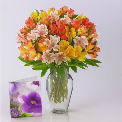 Illuminez votre espace avec un bouquet de 50 fleurs d’Alstroemeria (lys péruviens) aux teintes assorties. Composé de 12 tiges fraîches (4–5 fleurs par tige) pour une floraison durable. Hauteur env. 16 po (~40 cm). Carte de souhaits gratuite incluse; vase en option « Extra Touch ».