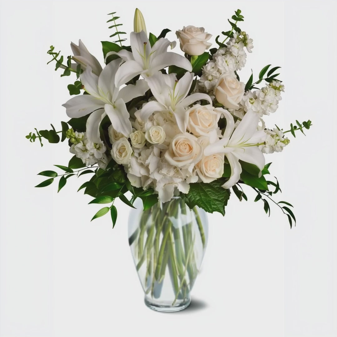 Le bouquet comprend au moins 18 tiges de la Collection Designer, en mélange harmonieux ou en mono-fleur (ex. délicates roses blanches), selon l’arrivage afin de garantir fraîcheur et qualité. Taille approximative : 55 cm (H) × 40 cm (L). Le vase n’est pas inclus mais peut être ajouté comme « Touches supplémentaires ». Le bouquet final peut différer de la photo.
