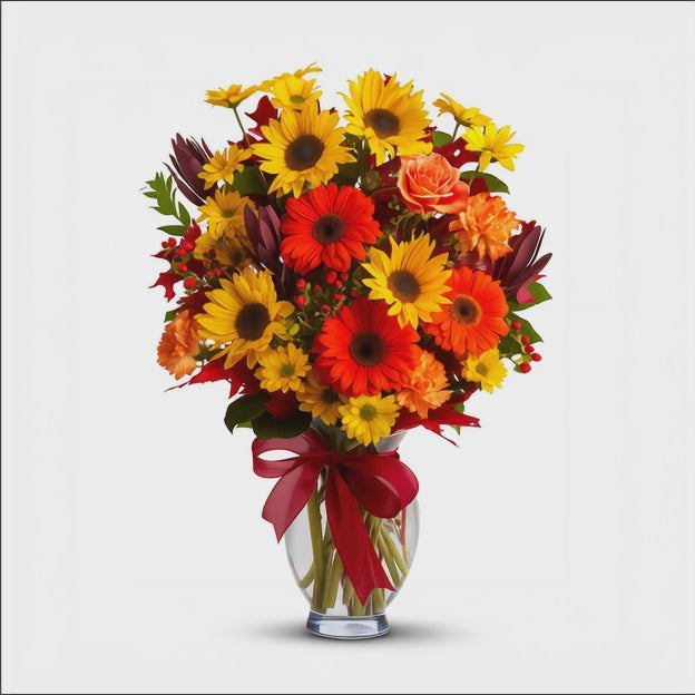 Égayez la journée de quelqu’un avec Gloire d’automne, un bouquet chaleureux où tournesols radieux et gerberas éclatants célèbrent les couleurs de la saison. Jaunes ensoleillés et oranges profonds, rehaussés d’une verdure luxuriante, créent un arrangement joyeux—parfait pour un anniversaire, un rétablissement ou juste pour faire sourire.