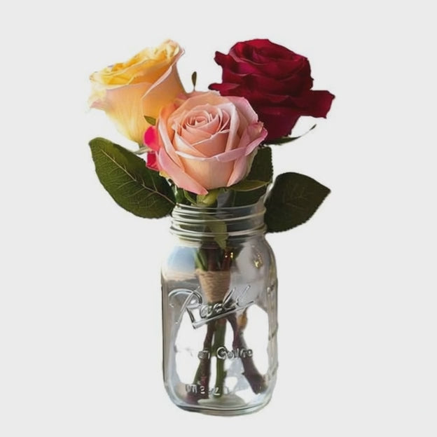 Ce petit bouquet comprend trois roses assorties de qualité supérieure, soigneusement sélectionnées pour leur éclat et leur fraîcheur, présentées dans un pot Mason rustique qui ajoute une note chaleureuse et artisanale à l’ensemble.